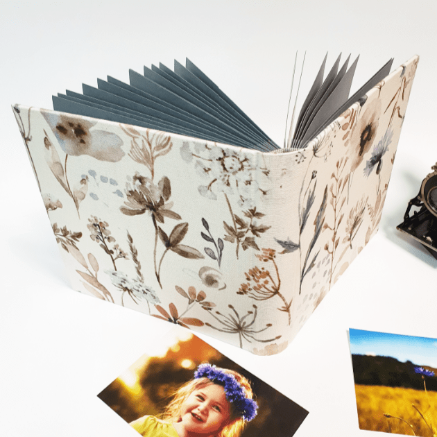 Mini album Baby to propozycja dla osób, które szukają albumu na mniejszą iość zdjęć. Jest to mniejsza wersja albumu Łąka, w pięknej lnianej tkaninie. Chabry oraz inne polne kwiaty pieknie skomponują się z każdą fotografię.