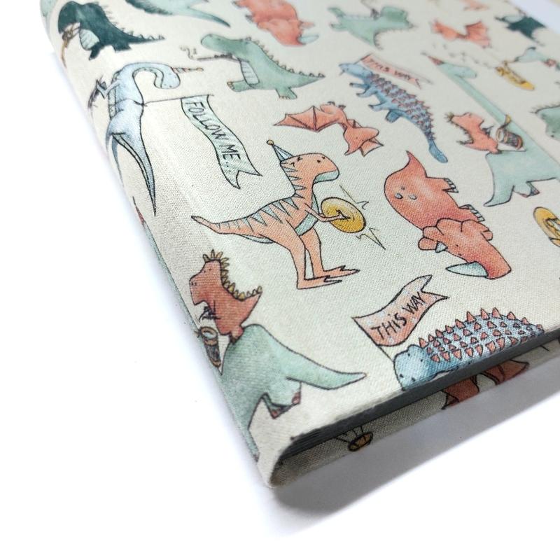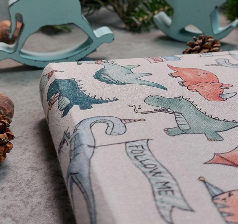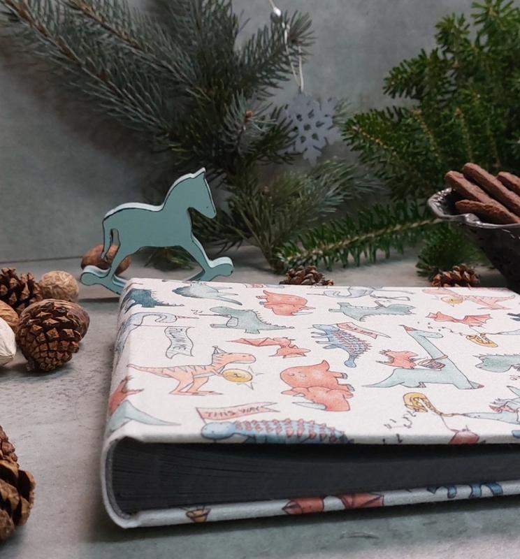 Dinozaury w dziecięcym świecie goszczą od zawsze. Tkanina, której użyłam do oprawy przyjechała do mnie ze skandynawi, gdzie od lat zaopatruję się w wyjątkowe i ekologiczne materiały. Jeśli sobie życzysz, wykonam w niej album w innym formacie, z inną ilością kart czy kolorze kart.