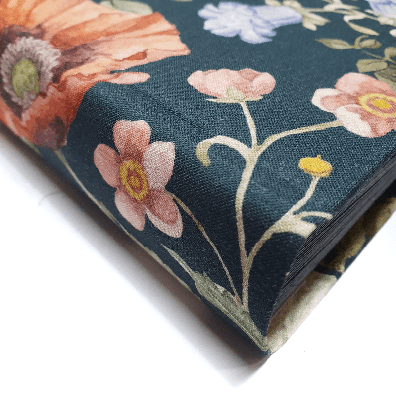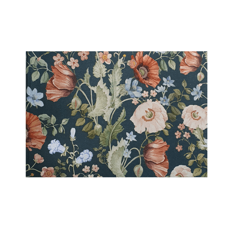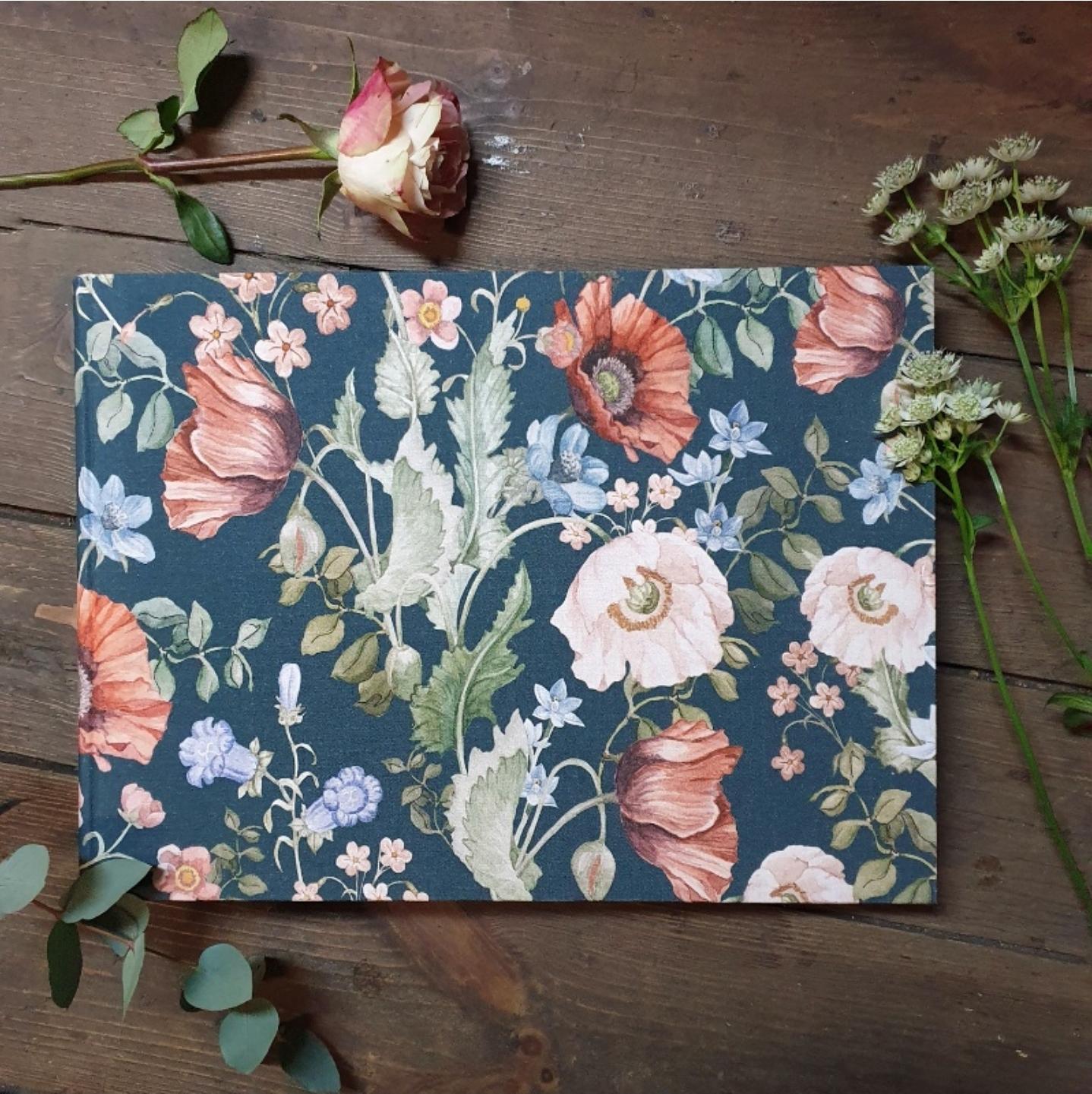 Ten wyjatkowy wzór, w który oprawiłam album, jest delikatny jak namalowane maki i wyjatkowo elegancki, przez szaro-granatowe tło. Każdy z egzemplarzy różni się od siebie układem roślinnym a wewnątrz ma karty w czarnym kolorze.