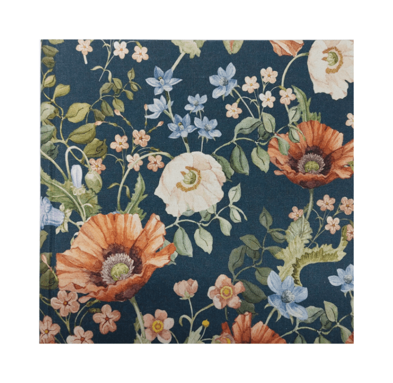 Ten wyjatkowy wzór, w który oprawiłam album, jest delikatny jak namalowane maki i wyjatkowo elegancki, przez szaro-granatowe tło. Każdy z egzemplarzy różni się od siebie układem roślinnym a wewnątrz ma karty w pięknym szarym kolorze.