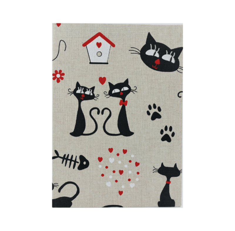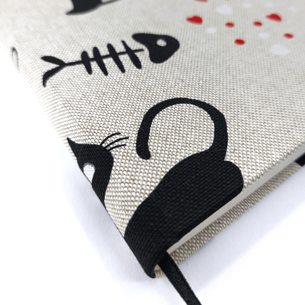 Uszyłam go od podstaw. Okładka z grubej litej tektury introligatorskiej, obłożona płótnem no i ta slodka grafika. Każda kociara będzie zachwycona. Wiem, bo sama nią jestem.
