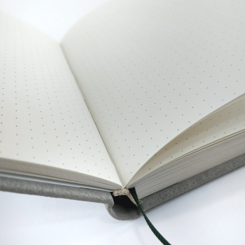 Uszyłam go od podstaw. Okładka z grubej litej tektury introligatorskiej, obłożona delikatnie zamszową ekoskórą no i ten liść paproci. Kartki wewnątrz są w kolorze ecru w kropki co 5 mm.