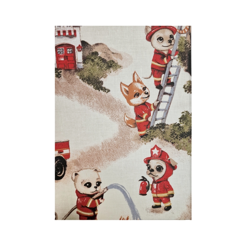 • Okładka: bawełniane płótno z wesołą scenką strażacką – piesek-strażak w czerwonym wozie pod remizą i mały miś z wężem gaśniczym. Grafika w stylu retro przyciąga wzrok i rozbudza wyobraźnię o bohaterskich akcjach.
