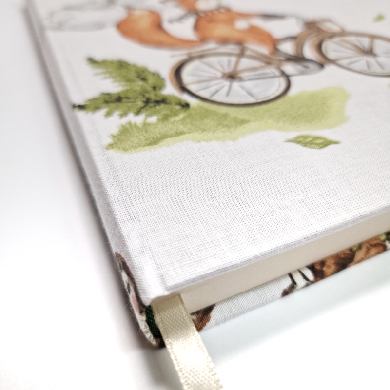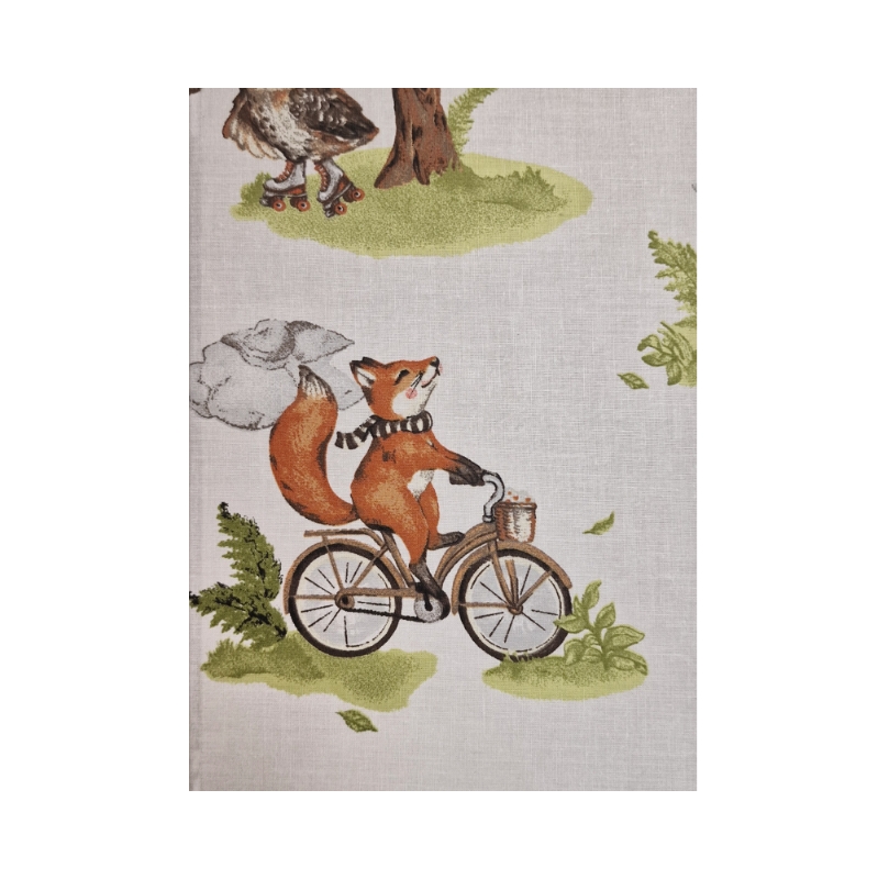• Okładka: naturalne płótno bawełniane z wesołym liskiem pędzącym na rowerze przez zielony las; ilustracja w stylu retro natychmiast poprawia humor i zachęca do działania.