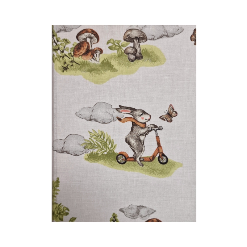 Okładka: naturalne płótno bawełniane z wesołym liskiem pędzącym na rowerze przez zielony las; ilustracja w stylu retro natychmiast poprawia humor i zachęca do działania.
