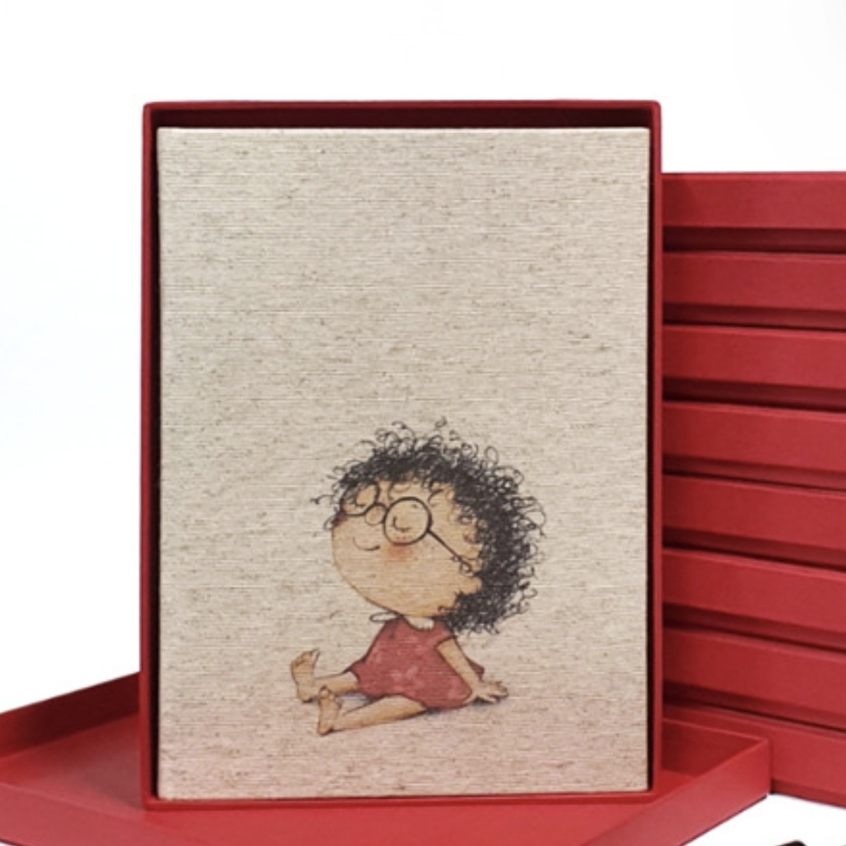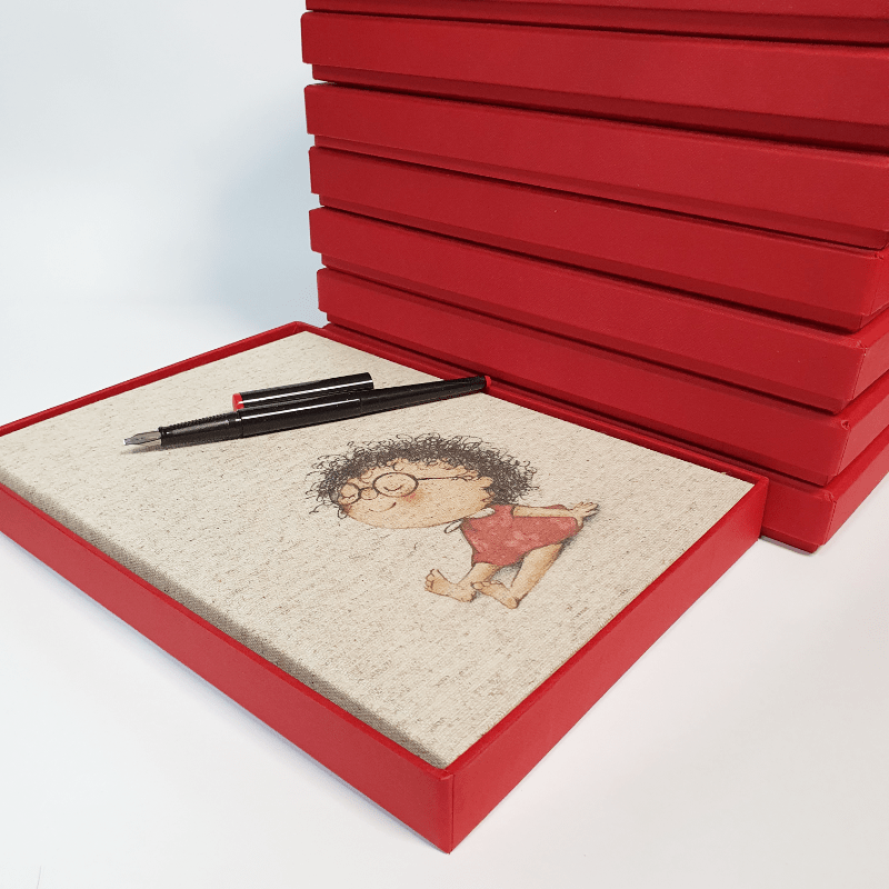 Uszyłam go od podstaw. Okładka z grubej litej tektury introligatorskiej, obłożona płótnem no i ta słodka grafika.